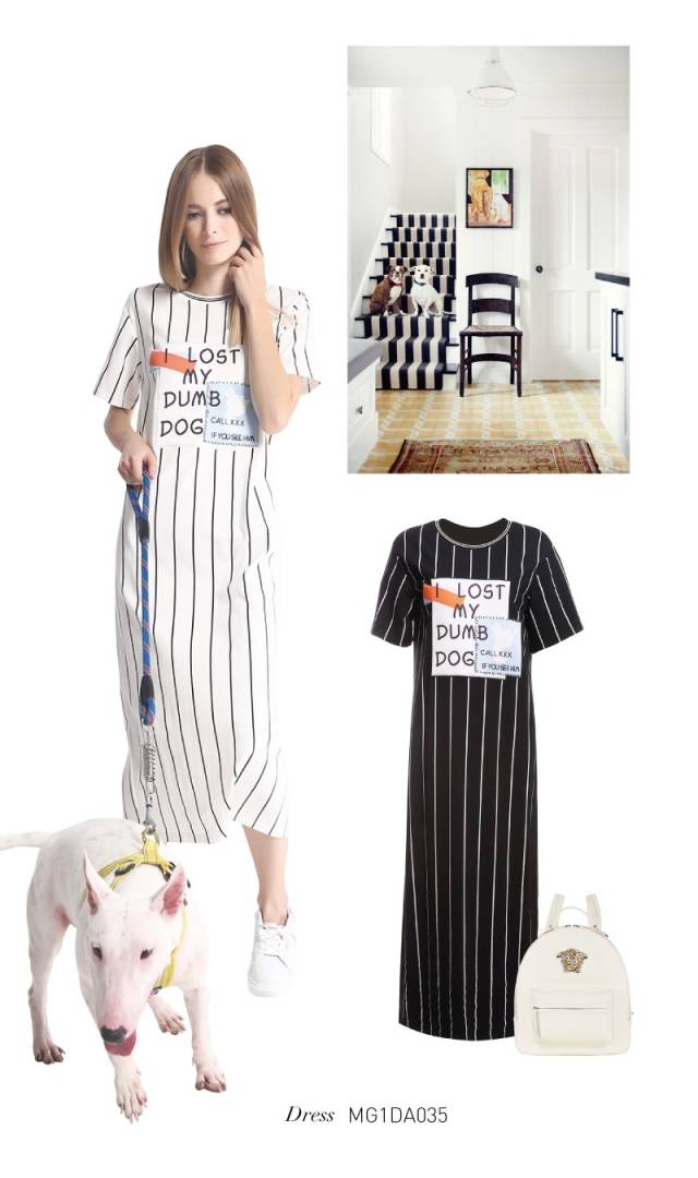 汪星人出没!长款条纹H型连衣裙,配合超有趣味的丢狗启示,让人忍俊不禁的笑出声来!你以为直筒设计会让你更胖?穿过才发现其实很显瘦!