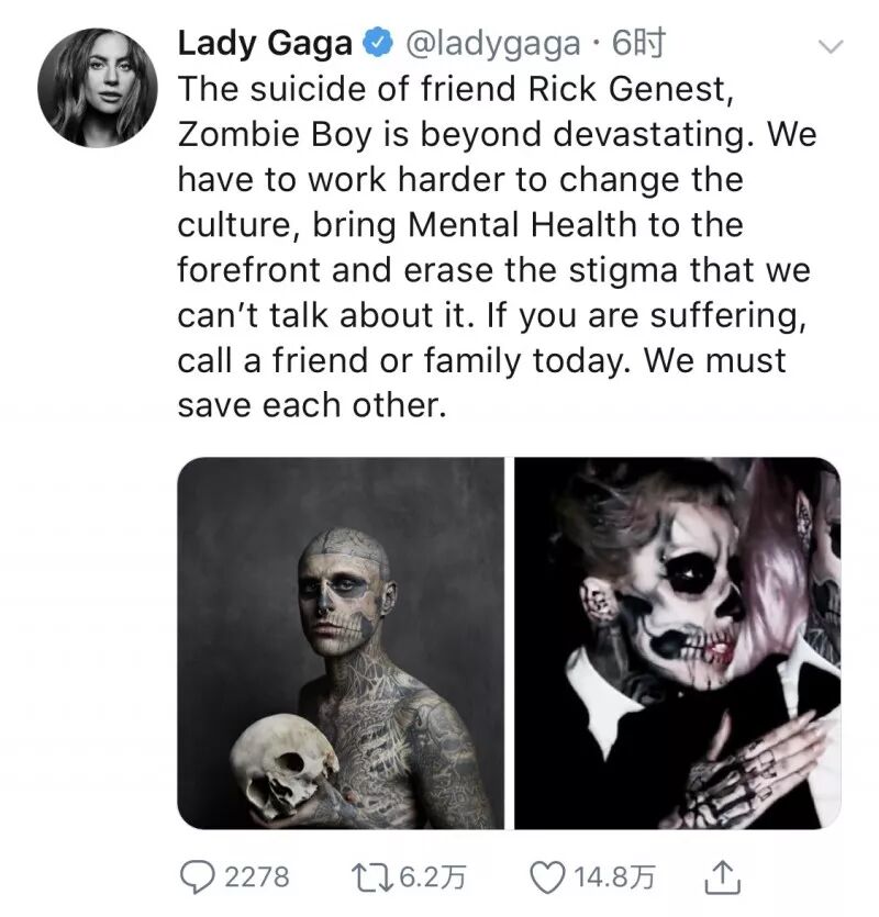 Lady Gaga在Twitter上发布悼文,同时也呼吁大家要关注身边的人。据世界卫生组织统计,全球每年会有80万人死于自杀,而大部分自杀原因都来自于心理问题。