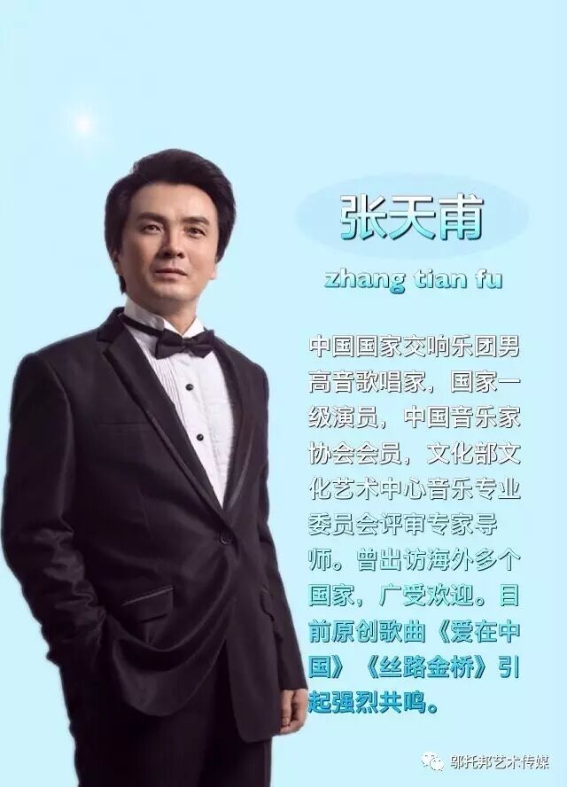 张天甫 中国国家交响乐团男高音歌唱家,国家一级演员。代表作有:《湘江北去》 《爱在中国》 《芷兰花》 《龙腾序》《油茶花》《我的草原我的阿妈》等。作为中国交响乐团主要演员,多年来演唱了大量中外大型套曲,在上千场音乐会上担任独唱、领唱、重唱,演唱的作品有:莫扎特《安魂曲》、威尔弟《安魂曲》、勃拉姆斯《安魂曲》、巴赫《降B小调弥撒》、亨德尔《弥赛亚》,歌剧《魔笛》《茶花女》《艺术家的生涯》《阿依达》《图兰多》《托斯卡》《弄臣》等,贝多芬的《梦幻曲》《第九交响曲》以及交响乐《沙家浜》《黄河大合唱》《祖国颂》 ,毛主席诗词《十六字令山》《冬云》,中国歌剧《江姐》《阿诗玛》《望夫云》等。