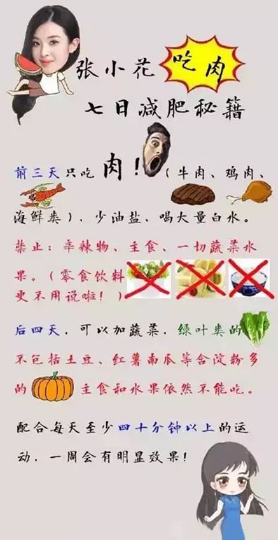 这7天,她在饮食上控制得比较严格,还在微博上公布了自己的『张小花“吃肉”七日减肥秘籍』的饮食篇。