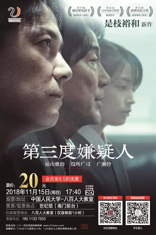 2018年11月15日(周四)17:45《第三度嫌疑人》将在中国人民大学八百人大教室上映。
