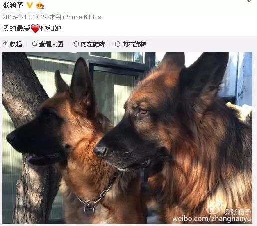 15年的时候,张涵予就已经在微博晒出狗狗的照片,“最爱的他和她”