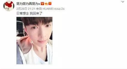 昨晚张艺兴更博晒自拍,配文:日常想念,我回来了