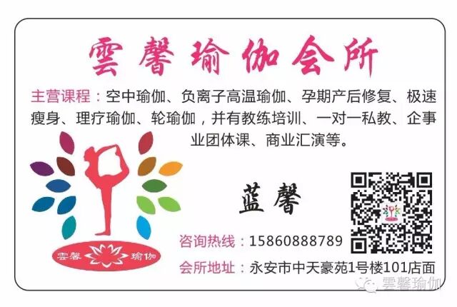 雲馨瑜伽是永安唯一一家纯粹的专业纯瑜伽会所。旨在传播最纯粹的瑜伽文化。会所拥有专业的教练团队,致力于开发新颖专业瑜伽,规范教学体系,从各方位专业化、多元化设计课程。如:急塑瘦身、孕产瑜伽(备孕、孕期、产后瑜伽)、肩颈脊柱理疗、缓解经期综合症、调理亚健康、心灵减压与睡眠调理瑜伽等,立足专业、提升效果、关注健康。
