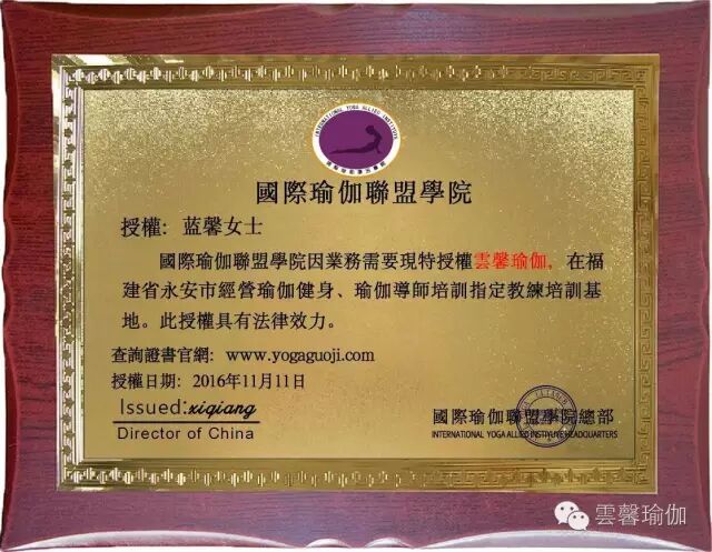 雲馨瑜伽于2016年11月11日被国际瑜伽学院授权为福建省永安市唯一一家经营瑜伽健身,瑜伽导师培训指定教练培训基地。