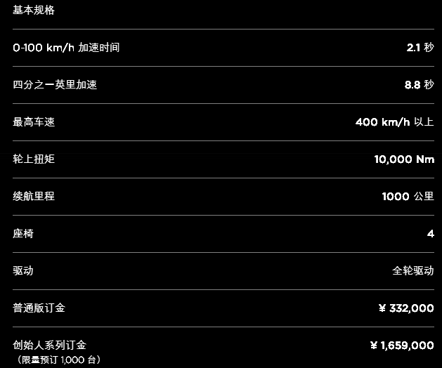 官方信息显示,Roadster 2将于2020年上市。相对于第一代Roadster并未在中国大陆地区销售的悲伤,第二代Roadster早早就开启了中国官网的预定,预定信息显示,该款车型分为Founder和普通版,其中前者需要交付165.9万定金,后者则需要交付33.2万定金。而中国官网也只能通过电汇方式支付定金,最终交易价格仍是未知数。