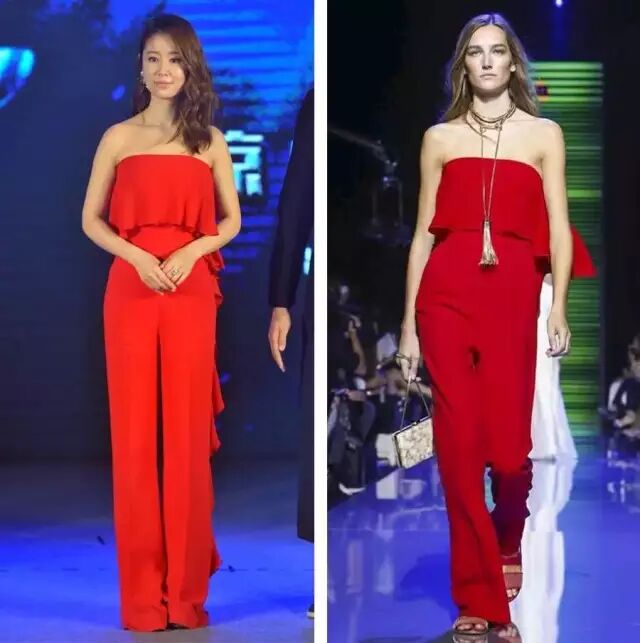 林心如身着Elie Saab 2016春夏系列亮相电影发布会,一向喜欢乱穿衣的她,这次选择红色抹胸连体裤,跟欧阳娜娜那套如出一辙。一下子把女神形象淹没的一点不剩!