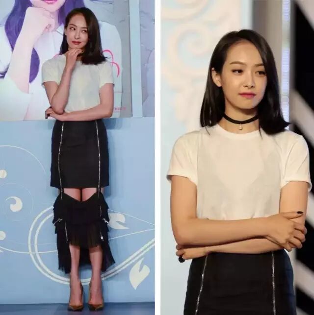 宋茜这身用简洁的白色T恤搭配拼接流苏下摆的长裙干净利落。搭配choker简直就是“天仙攻”有木有!