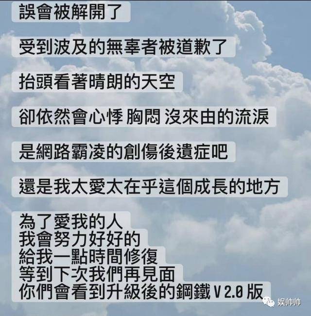 在这场闹剧结尾之时,徐若瑄也在社交平台表示:“误会被解开了,受到波及的无辜者被道歉了,抬头看着晴朗的天空,却依然会心悸、胸闷,没来由的流泪,是网络霸凌的创伤后遗症吧,还是我太爱太在乎这个成长的地方了。”在结尾徐若瑄也是鼓励自己:“为了爱我的人,我会努力好好的,给我一点时间修复,等到下次我们见面,你们会看到升级版的我”最后,徐若瑄也希望大家保持良善。