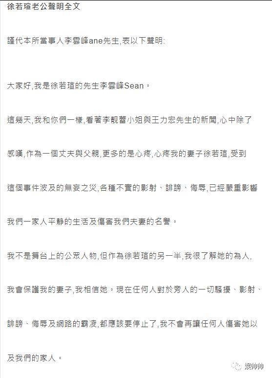 可以看出,这次的风波让徐若瑄元气大伤,知情人也告诉大家,徐若瑄也因为这件事,茶不思饭不想,一下子暴瘦九斤。而看到这样的徐若瑄,她的丈夫李云峰真的心疼,他表示自己虽然不是公众人物,但作为丈夫,真的很心疼妻子,并称网络暴力已经严重影响了自己一家人的生活,希望大家停止网络暴力,同时也承诺自己再也不会让任何人伤害自己的家人了!