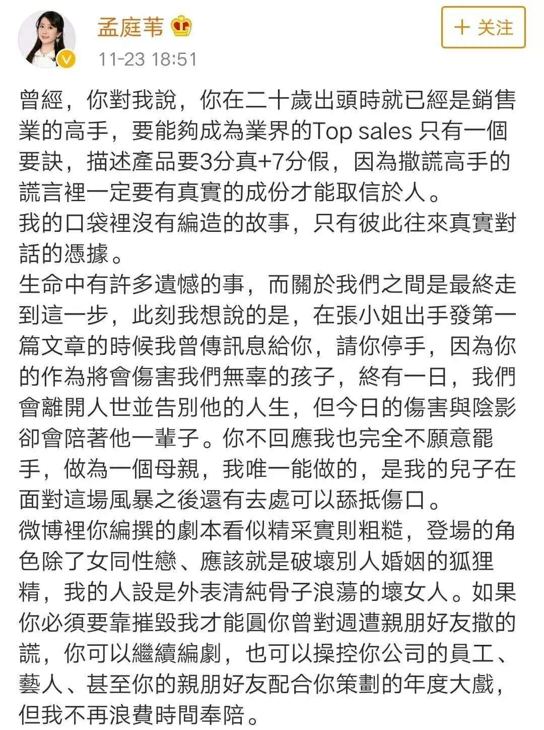 两天后,张志鹏深夜发文再补一枪,称自己是被逼离婚,原因是他撞破孟庭苇和女助理的恋情,并暴打了一顿女助理,为此孟庭苇还气的离家出走。