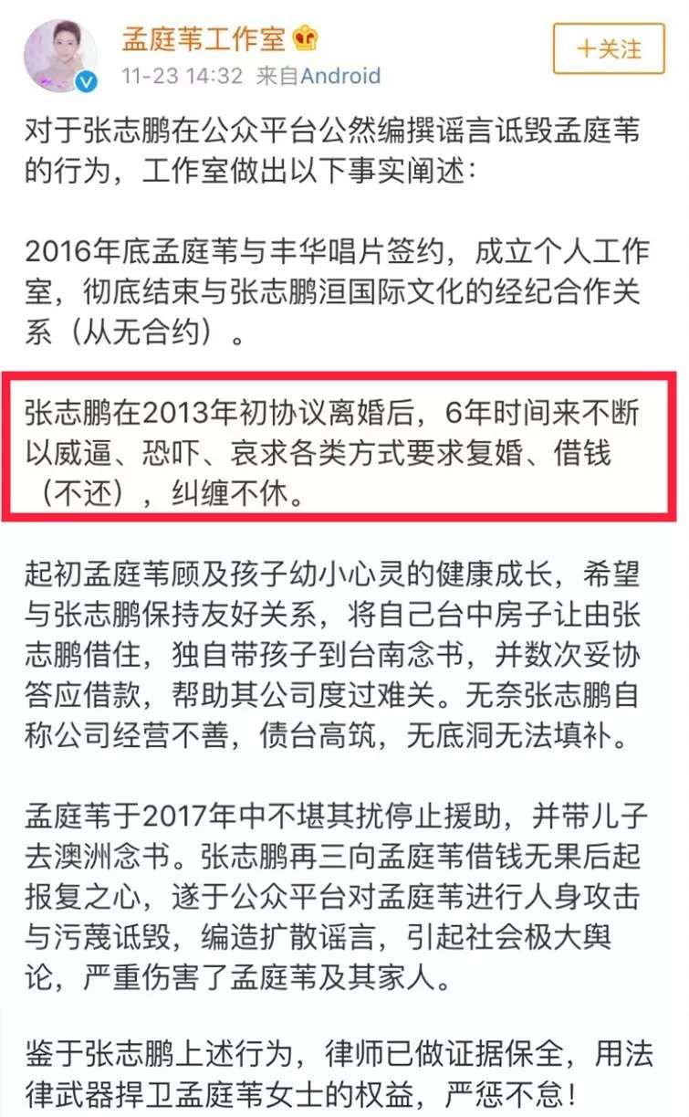 忍无可忍的孟庭苇发出律师声明,将自己和张志鹏的聊天截图、借条等证据公之于众,证实张志鹏家暴、反复借钱,并称两人早已离婚多年。
