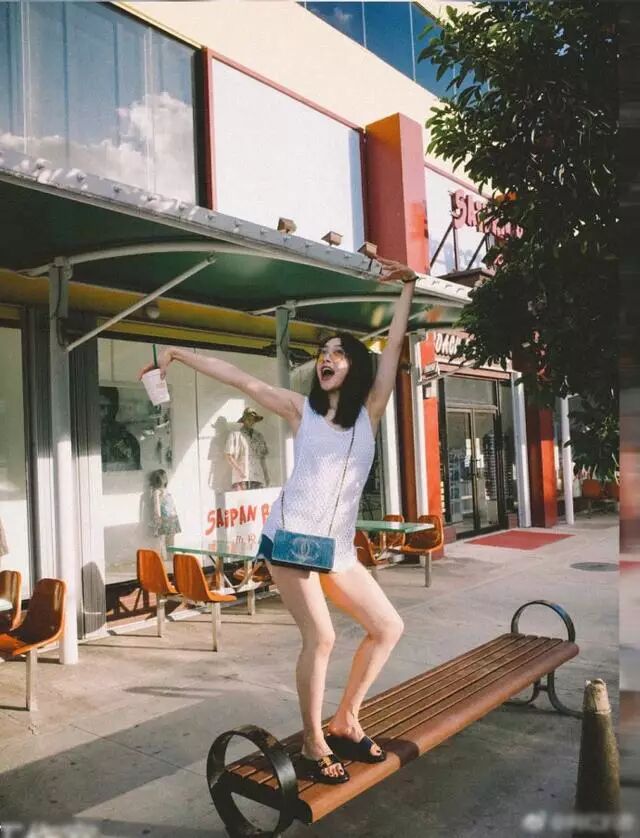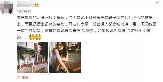 刚刚看到有位知名博主po出了两张宋茜的照片,照片中宋茜穿着清凉,穿着拖鞋站在公共场合中的座椅上,并且看起来很嗨的样子。