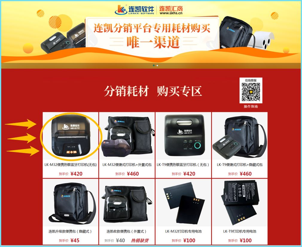 连凯分销平台专用办公耗材包括LK-M32便携热敏蓝牙打印机,LK-T9便携热敏蓝牙打印机,连凯收款便携包,热敏收银纸及电池等,产品由连凯软件和厂家联合提供,质优价廉,提供打印机主机质保16个月、电池12个月的售后服务。(正常情况主机质保12个月、电池6个月,连凯经销商专享超长售后)