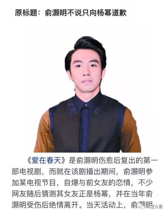 而后俞灏明复出,当初出事的电视剧《爱在春天》播出,网络上突然有了关于二人恋情的新闻通稿,所有人大骂俞灏明,为了复出不择手段,为了炒作不择手段。