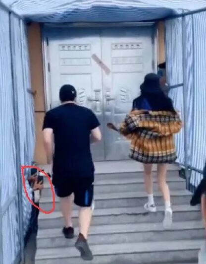 在曝光的图片中,杨幂身穿紫色上衣搭配超短裤,通道楼梯旁的棚布后有偷拍者正拿着手机拍摄,镜头正对杨幂的大腿处。