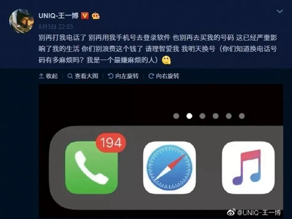 不胜其烦的王一博,终于在8月3日爆发了,他恳求说:“别再打我电话了,别再用我手机号登录软件了,也别再买我的号码了。”