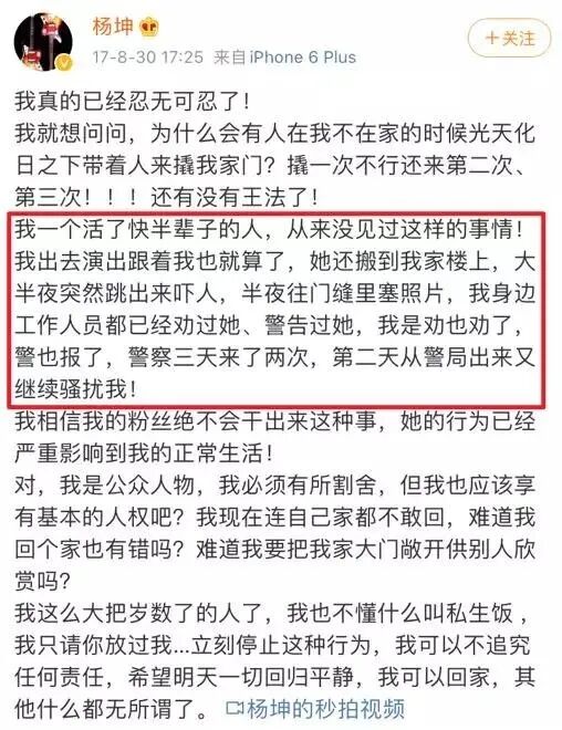 无奈之下杨坤发了一条崩溃的微博:“我是公众人物,我必须有所割舍,但我也应该享有基本人权吧?”