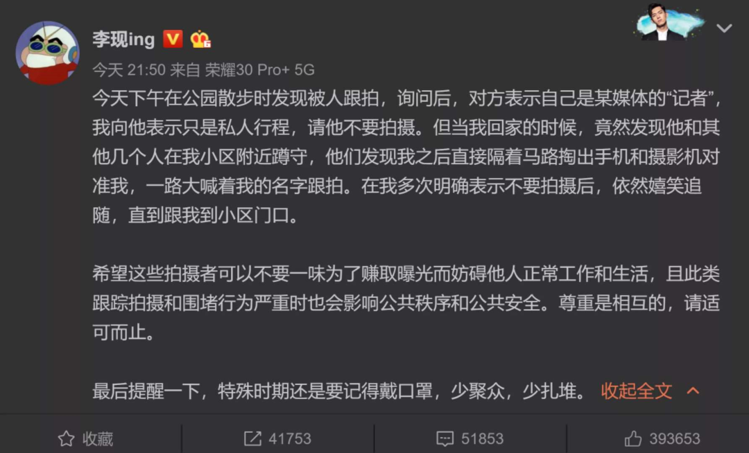 近期的热搜就能印证这一点。5月13日,李现在公园散步时被偷拍,几次劝阻无效后,偷拍者一直尾随至其家门口。