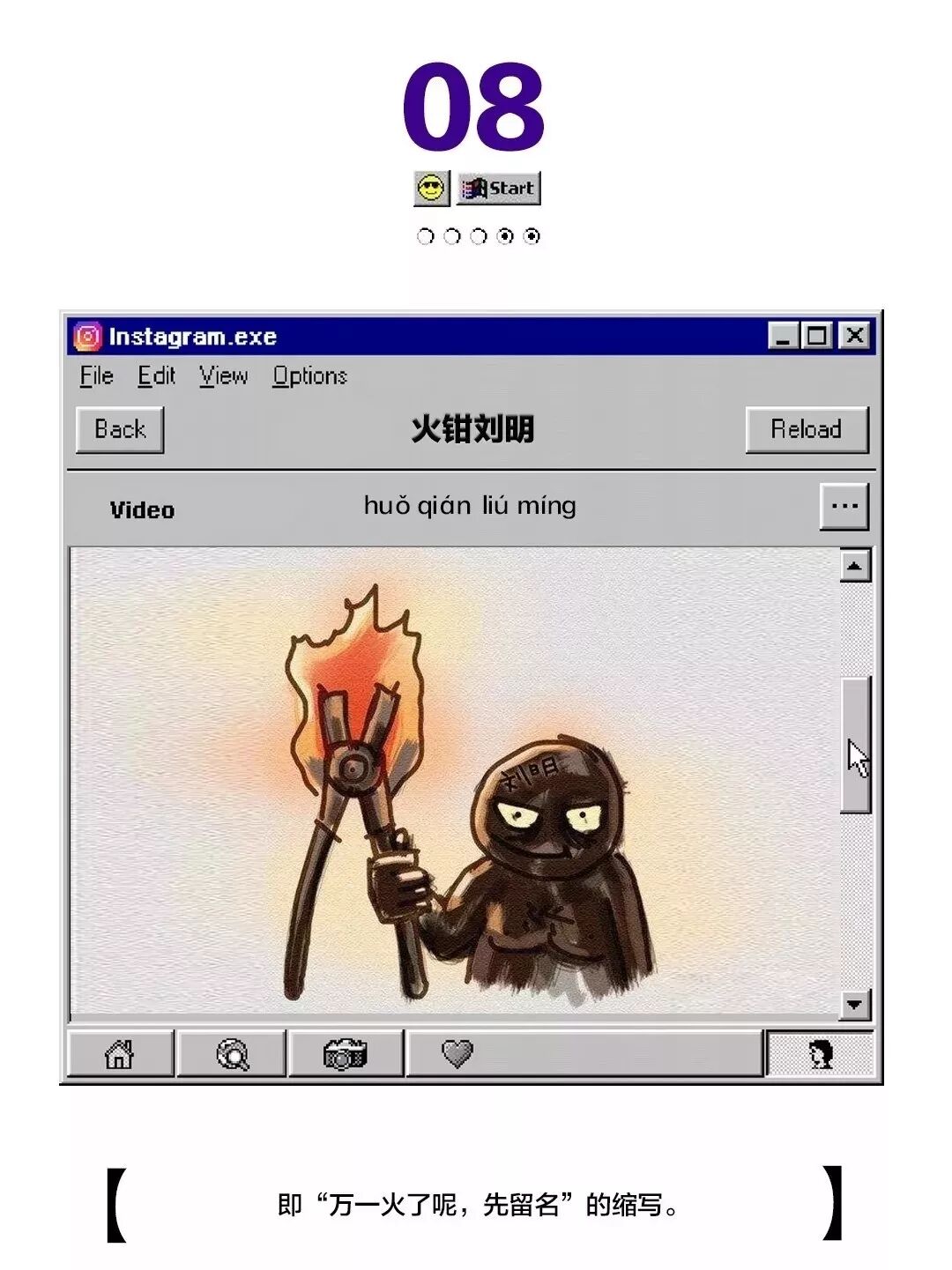 告诉大家一个装X必备技能:当发现一个很有意思感觉会火的视频或者其他东西,又不敢自己主动转发留言时,就适合在弹幕上默默留下“火钳刘明”四个大字。
