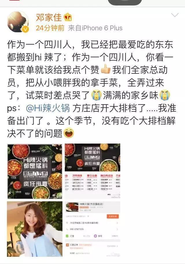 娱乐圈的许多明星除了拍戏之外,很多还有自己的副业,尤其是餐饮业是很多明星的首选。吴昕的泰国餐厅,李晨的面馆,黄晓明的奶茶店,孟非的小面以及黄磊的黄小厨等等。当然即使投资到餐饮还是有一定风险的,有人做的风生水起,有的却是生意惨淡。因《爱情公寓》而大火的小姨妈邓家佳的“Hi辣火锅”,也不甘示弱进入餐饮业,并且还做的是相当的不错。
