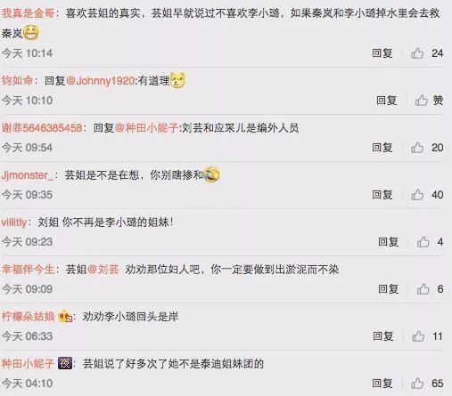 网友还表示:“刘姐怎么回去面对泰迪闺蜜,你不再是李小璐的姐妹!”,随后有网友表示:“芸姐早就说过不喜欢李小璐了,如果秦岚和李小璐掉水里会去救秦岚。”、“刘芸和应采儿是编外人员。”