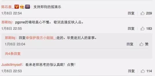 还有网友表示:“支持郑钧的摇滚乐!”、“pgone的嘻哈真心不懂,歌词直接反映人品!”