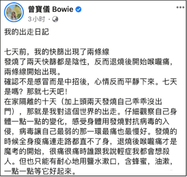 5月30日,曾宝仪发文称,自己一周前的快筛呈现两条线,出现发烧及喉咙痛的症状