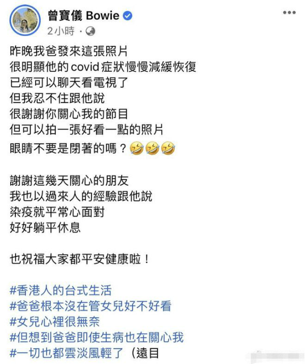 24日,女儿曾宝仪在社交平台发文透露曾志伟的病况,表示“很明显他的COVID症状慢慢减缓恢复,已经可以聊天看电视了。”