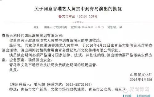 网曝黄贯中来青演出批复