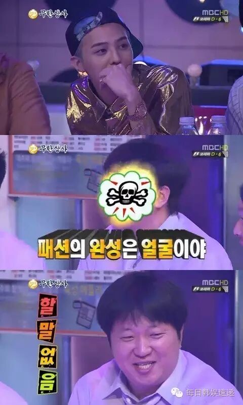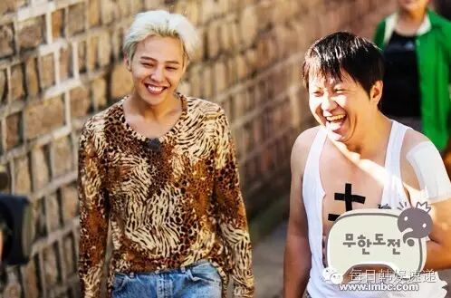 在早期,无限挑战就多次提起GD,还搞笑翻拍了Bingbang《谎言》的MV,刘大神模仿过太阳的《眼,鼻,嘴》,再歌谣祭里唱了top的rap,大也多次表达了对GD的喜爱。