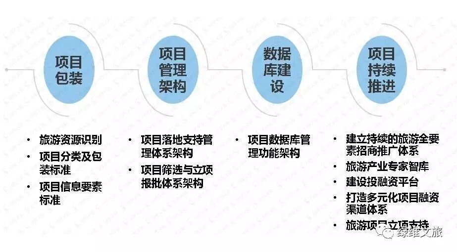 基于项目的旅游产业开发管理是旅游产业发展中最重要的工作,为了解决地方旅发委如何开展旅游产业开发建设管理的问题,由此形成一套项目管理体系的建设思路,绿维文旅从旅游资源识别、项目包装、入库进行投融资分析和动态管理,到项目的政策支持、招商落地,形成了一体化项目管理体系,为地方旅游发展提供重要的管理支撑。