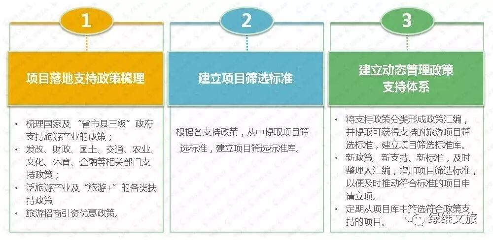以项目为基础,形成七个方面的旅游产业促进工作:旅游环境与政策保障措施、旅游基础设施建设、旅游公共服务设施建设、传统旅游行业的创新与改革、旅游+的泛旅游产业整合、旅游城镇化发展、新业态与新IP导入。