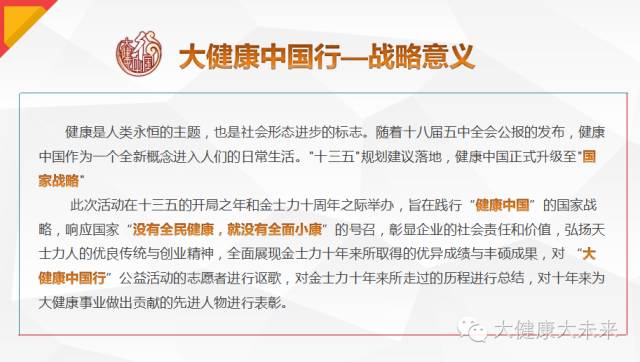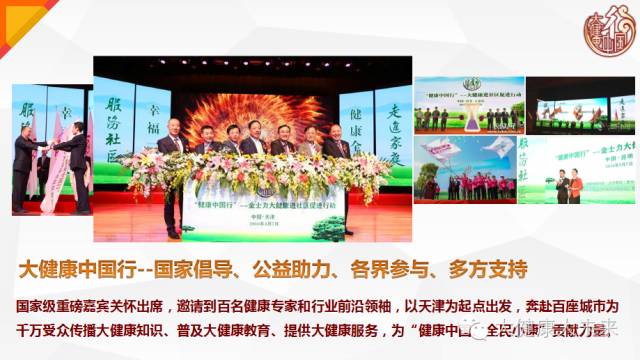 2016年,金士力佳友在中国保健协会的指导下,以“大健康中国行”为主题组织百名专家、走进百座城市、开展百场健康讲座,旨在通过健康讲座、健康咨询服务等多样化的形式与大众进行交流互动和健康科普教育,提升全民健康意识,让社会各界共同关注健康,同时引导大众体验大健康服务,全面推进大健康进万家工程,为“健康中国”贡献力量。本次大健康中国行——金鼎之约暨金士力十周年庆典,汇聚万名“健康中国行”志愿者,于6月17日在天津·奥林匹克中心体育场举行盛大活动。