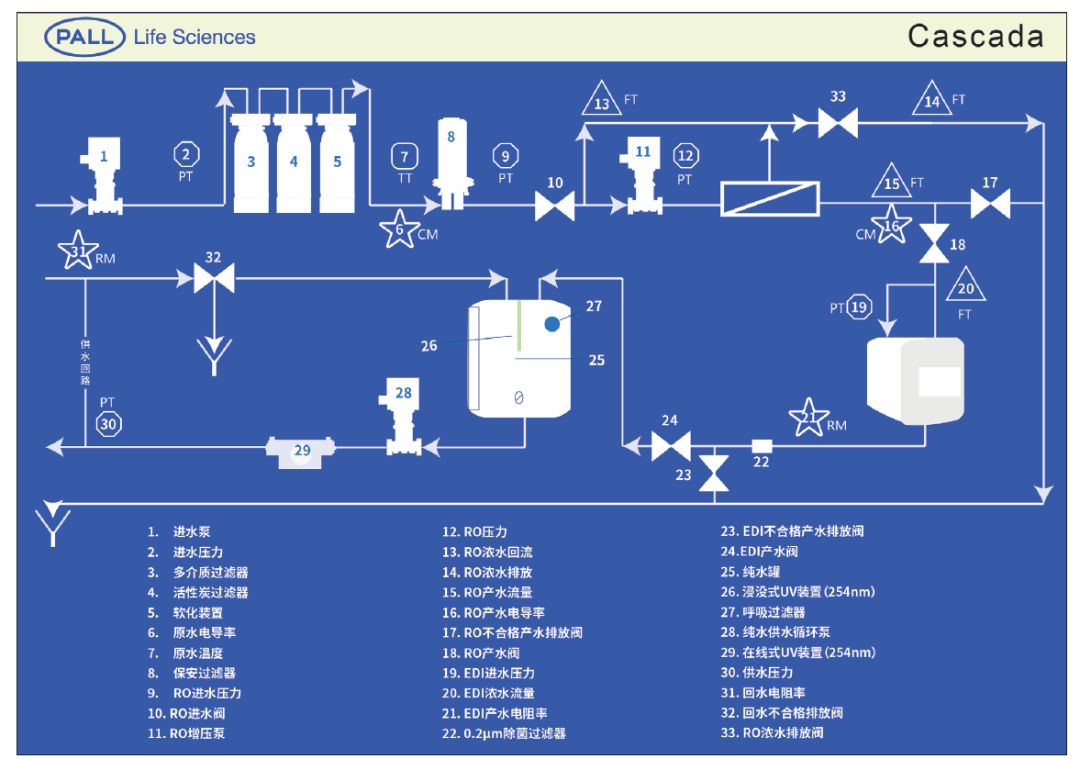 Cascada Ⅱ 系列整体化大流量纯水系统,以城市自来水作为原水,通过砂滤、活性碳过滤和软化等标准化工业预处理,结合反渗透与EDI 等先进的纯化单元,及微滤除菌,形成一流的优化工艺流程,制备符合客户要求的纯水。