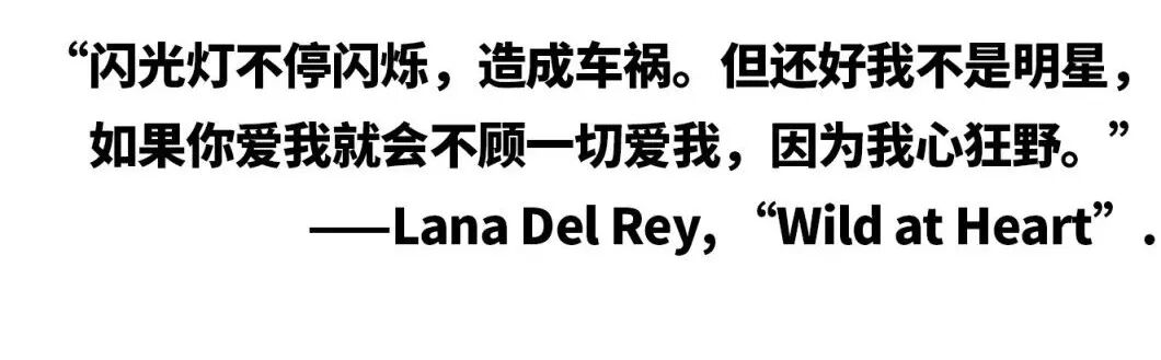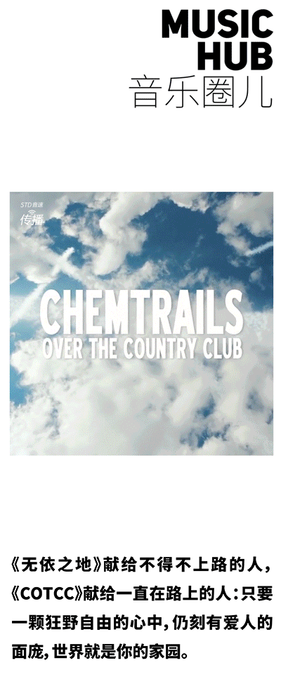 封面上有一个细节:被压在餐桌下的手机经过多张专辑的铺垫,Lana这次音乐风格全面走乡村民谣路线,没有任何听起来庞大的配器,从头到尾安安静静、干干净净。内容上无限地自省,却可以说是她最广袤的作品,像极了赵婷的《无依之地》里绵延的山脉风光。而对于公路美学、民谣和乡村音乐,精髓就是流浪和自由。专辑里有一首歌名叫做:“Not All Who Wander Are Lost”,引自托尔金的《魔戒》,意为“不是所有的流浪者都迷失”。现代人都是“流浪者”,难逃在路上,Lana就是比较极端的代表。“我一直活在路上”——纽约出生的她这样描述自己。真正成名前一直住酒店、在酒吧驻唱,开车浪迹于多个城市之间,但她的内心从未失去方向。对于Lana这样的流浪者而言,上路只是为了更好地寻找和接纳自我。打雷多爱上路多爱车?看她每张专辑跟车的关系就知道了!“我来自无名小镇,你呢?我会提到这点,因为我已准备好离开洛杉矶,希望你与我同行。”Lana Del Rey跳上自己的小皮卡对你唱道。《无依之地》献给不得不上路的人,《Chemtrails》则献给一直在路上的人,不论是不是因为迫不得已而上路,我们都一样。只要一颗狂野自由的心中,仍刻有爱人的面庞,世界就是你的家园。Lana把弟弟妹妹和好朋友们都放到了封面