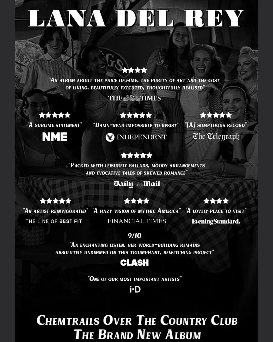 打雷姐Lana Del Rey上周发行了口碑炸裂的新专辑《Chemtrails Over the Country Club》,一周时间过去了,综合评分仍维持81高分。 《Chemtrails》乐评一览全球销量超过1200万,Lana Del Rey是十年来销量最高的另类音乐女歌手,以晦涩的歌词和神秘的意象著称,仍收获一大批忠实信徒。新专辑宣传语直接写在飞机云上高产如她,还宣布了将发行一部新诗集和一张新专辑。为了确保你在雷姐新作品之前弄懂这张专辑,省得之后新知识点跟不上,赶紧看下去吧! 粉紫色的天空印着飞机云,成排的红色老爷车经过老式广告牌、唱片店、剧院,这里永远夕阳笼罩永远飘扬着音乐——欢迎来到打雷小镇Lana Del Rey Village。打雷小镇,是Lana为宣传新专辑做的虚拟周边商店,像极了GTA洛圣都,只不过表面上没有血腥暴力,而是满满的诗情画意。打雷小镇Lana Del Rey Village截图Lana还在线下打雷小镇快闪店内开了占卜摊Lana这张专辑就如同她创造的虚拟小镇一样,从标题《Chemtrails Over the Country Club》(直译为“乡村俱乐部上的飞机云”)两种意象,一个天上一个地下,一个诗和远方一个工作和当下,意味着专辑的每个角落充满了幻想与现实的对比。之所以说表面上没有血腥暴力,Lana可是出过一张专辑叫做《Ultraviolence 超暴力》,自然少不了邪恶元素。在BRTHR执导的首支同名单曲“Chemtrails Over the Country Club”MV中,Lana就携手姐妹们完成了美国乡镇女青年到邪典电影《范海辛》中女狼人的转变,引得无数歌迷欢呼。“如果你非常想做一个正常人,却有一个过度兴奋的、古怪的大脑,那么‘Chemtrails’就是你想要的。”Lana这么评价这首歌,她生活在自己创造的梦中小镇,并邀请你共同加入。“Chemtrails Over the Country Club”MVLana和Joan Baez、Stevie Nicks实际上,她的六张专辑每张都在为她的小镇添砖加瓦,过去是众神和妖魔共处(单曲“Gods & Monsters”),耶稣、猫王、梦露、Jim Morrison一个个作为符号出现。现如今,你能想象到传奇民谣女将们Joni Mitchell、Joan Baez、Stevie Nicks和女狼人Lana如何共舞吗?《Chemtrails》就是这样一个当代美国神话。从首张专辑《Born to Die 向死而生》开始,Lana Del Rey就建立起纸醉金迷的好莱坞女郎人设。没想一晃十年,她的名气越来越大,角色却越来越小。形象从身穿白色泳装的好莱坞女明星变成了白裙服务员,她也唱道:“当我仍是名穿着白裙的服务员,反观我如何获得如今这一切,这让我感觉自己像上帝。” 角色和心境不停变换,唯一不变的是纯洁的白色本质。“White Dress” MV在录影带中扮演过总统夫人、脱衣舞女、圣母、女杀手、女巨人等各种“狠角色”的Lana,将自己重新放入曾经的服务员角色,绝对是内心更强大的象征。拥有越大的舞台姿态越低、越真诚,她的野心和其他明星不一样。没什么打雷宇宙,只是打雷小镇而已——空荡荡的未来幻想曲从来不属于她,对世间百态的关怀和包容充满她的灵魂。《我心狂野》海报