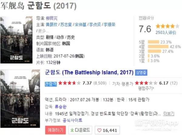 从评分来看,《军舰岛》有7分左右,远不及随后上映的《出租车司机》(韩网、豆瓣均为9分+)▽