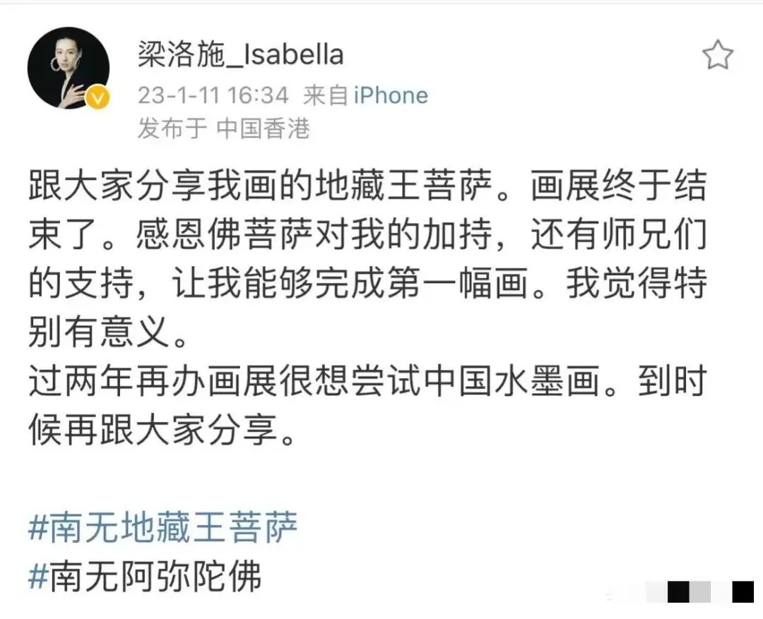 梁洛施一心向佛,哪里都没去,画地藏王菩萨的画像举办画展,将来还想继续作画举办画展。