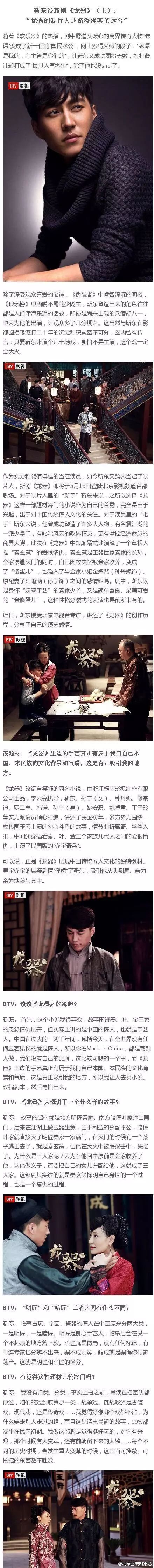 新剧相关|靳东谈新剧《龙器》 靳dongboy每日资讯 内地男星 2016-05-17 23:01:39 558 创作不易,用心坚持,欢迎请BaGua喝几杯爱心咖啡!打赏并支持本文 打赏并删除本文 历经两年的雕琢,由靳东担任总制片人,出品人、主演的电视剧《龙器》即将于5月19日北京影视频道播出。根据@北京卫视剧集地消息,靳东接受BTV专访。来看靳东讲述《龙器》的创作历程,以及对中国传统技艺的情怀!靳东谈新剧《龙器》专访内容如下正文(上)后续,靳东谈新剧《龙器》专访内容(下),小编会及时更新! 创作不易,用心坚持,欢迎请BaGua喝几杯爱心咖啡!打赏并支持本文 打赏并删除本文 感谢您的支持鼓励,我会继续努力的!文章地址:用户邮箱:打赏金额:USDT 请输入数字点击”去打赏“,即可进行打赏支持本文章哦 靳东 About the Author 靳dongboy每日资讯 功能介绍:演员靳东最新最快最全资讯每日推送,非官方,欢迎关注! Related Posts 靳东剧耀东方!! 2018-03-17 23:08:43 靳东新图丨记我与靳崬同室共处的12个小时 2017-11-12 18:16:50 靳东更博&新剧照丨天冷啦,该吃甜橙啦~~~ 2017-11-07 19:37:57 靳东神秘新搭档9月21日为你揭晓 2017-09-17 21:50:13 靳东恋爱技能Max《恋爱先生》比利时直播拍戏 2017-08-04 23:55:34 发表评论
