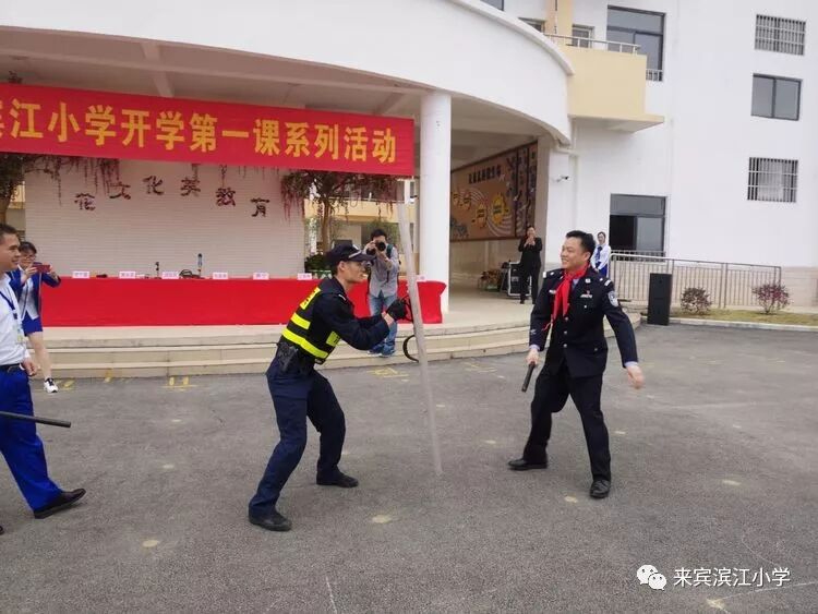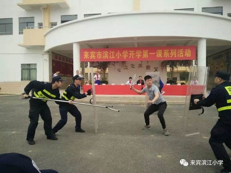 紧接着是来宾市公安局兴宾分局的警官们给孩子们进行了防暴安全演练。整个演练过程组织有序,配合默契,达到了演练的预期目的。演练后,警官们针对在校园范围内可能发生的突发性袭击,如何冷静应对、与其周旋等待警方支援的技巧,并现场演示了各种防暴器具的使用方法等。通过此次演练,加强了学校师生的安全意识和责任意识,为更好地开展校园安保工作提供了保障。我校的法制副校长---来宾市公安局兴宾分局汤加良副局长还给全校师生上了一堂“法治安全开学第一课”。他从遇到危险怎么办?冬季如何预防一氧化碳中毒?看到有人落水时应该怎样施救?如何提高安全防范意识?等四个方面进行讲解并给我校捐赠各种防爆器材。