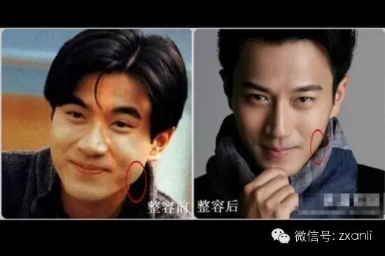 下颚通过贴出刘恺威整容前后的对比照,网友称刘恺威的下颚明显变化,整容前的下颚角非常突出,整个脸型呈现出国字脸型,经过下颚角整形手术(磨腮)后,刘恺威的脸型变尖。