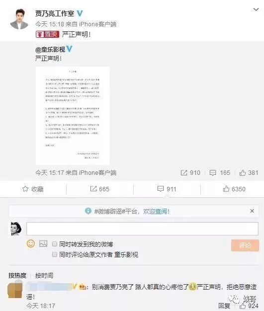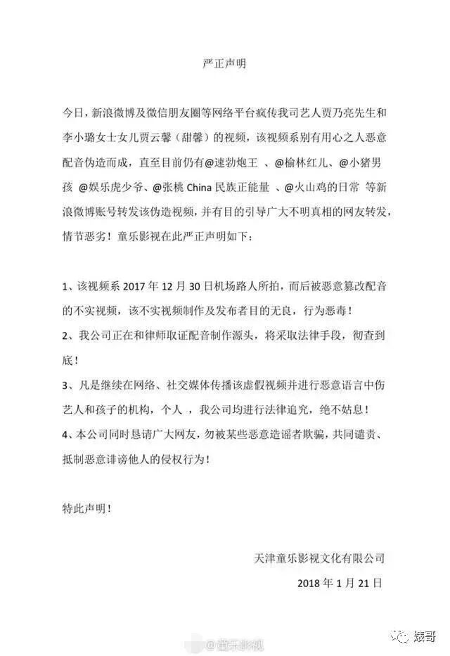 如果说上次贾乃亮发声,是保护了李小璐,这次贾乃亮的发声完全是霸气护妻儿。澄清道:该视频是别有用心之人恶意配音伪造而成,随后公布了一些恶意传播了这个视频的账号公布,造成了不明真相的网友转发,情节非常的恶劣