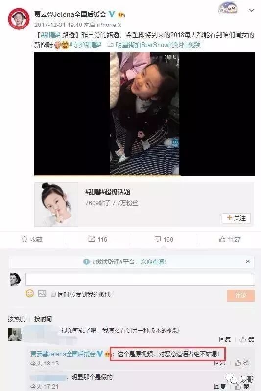 有网友说:视频剪辑了吧。我怎么看到另一种版本的视频。贾云馨全国后援会回应道:这个是原视频,对恶意造谣者绝不姑息!从时间上看,确实如声明中所说一样,是12月30日那天,一位网友拍的,当时贾云馨全国后援会还上传了该原视频