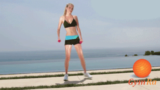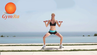 双脚分开比肩宽站直,两脚尖稍稍向外,双手各持一个哑铃向头顶上方举高,保持背部挺直,收紧腹部,然后双腿屈膝向下做扎马步,同时双臂曲肘,将哑铃举至与肩部同高,再慢慢恢复站姿。注意,下蹲时,膝盖不可超过脚尖, 背部要始终保持挺直状态。