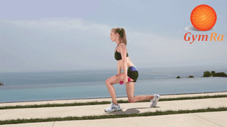 双脚并拢站直,双臂自然垂放于身体一侧,双手各持一个哑铃,保持背部挺直,收紧腹部,然后将左脚向后撤一步,同时双腿屈膝90度,向下深蹲,然后慢慢起身收回左脚,并恢复站姿。如此反复进行,完成后换另一侧继续。注意,下蹲时,膝盖不可超过脚尖,且背部要始终保持挺直状态。