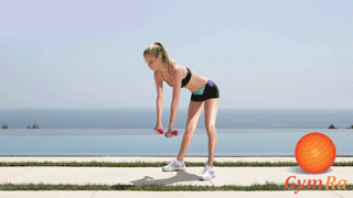 双脚分开与肩同宽站直,双手各持一个哑铃自然垂放于身体两侧,保持背部挺直,收紧腹部,然后使上半身向前俯低至与地面平行,同时双臂向下伸直,然后在慢慢恢复站姿,同时双臂垂放于身体两侧。