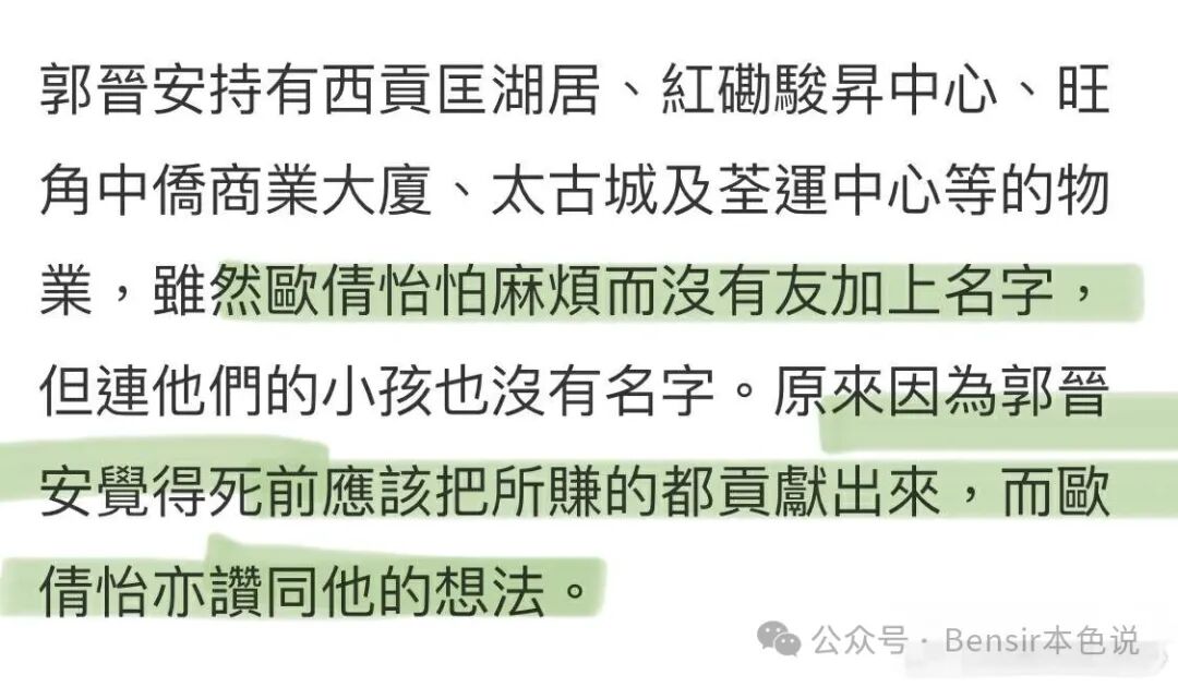 早年间是欧倩怡嫌麻烦没去加名字,郭晋安则一直认为死前要裸捐,所以也没写小朋友的名字。