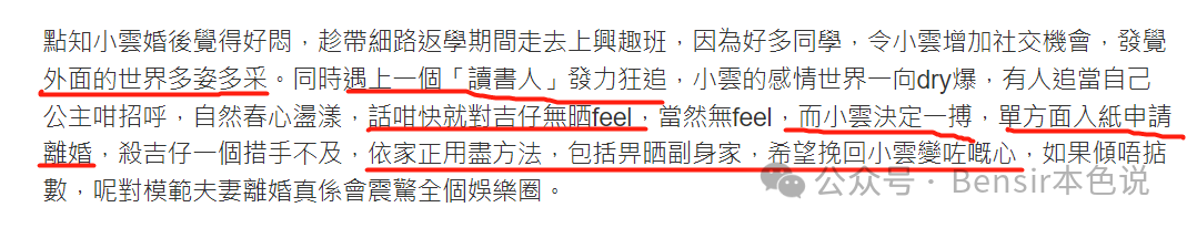 爆料文说,“小云去上兴趣班时增加了社交机会,发现外面的世界多姿多彩,同时一个读书人对她发力狂追。”