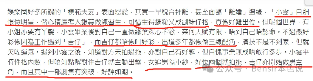 “后来吉仔其中一部剧集有突破,口碑大逆转,吉仔认为小云旺自己,因此决定正式和小云同居。”